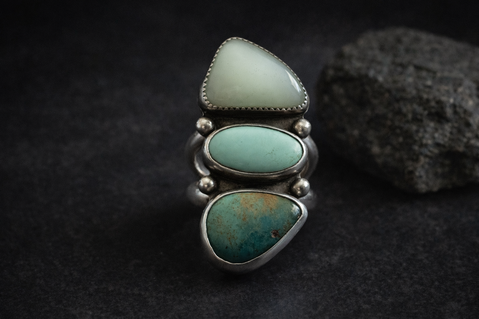 This stunning ring is a lovely rock stack for your finger, combining a vibrant mix of colors and textures. Handmade with intention in my Joshua Tree studio, it features a glowing chrysoprase stone perched atop a double stack of turquoise—a beautiful Royston in the middle and a classic Kingman at the base. The entire arrangement is set in sturdy sterling silver and features a comfortable double split shank. This is a bold and unique piece of wearable art that captures the spirit of the desert. It's a special treasure designed to make a statement and bring joy to your collection.