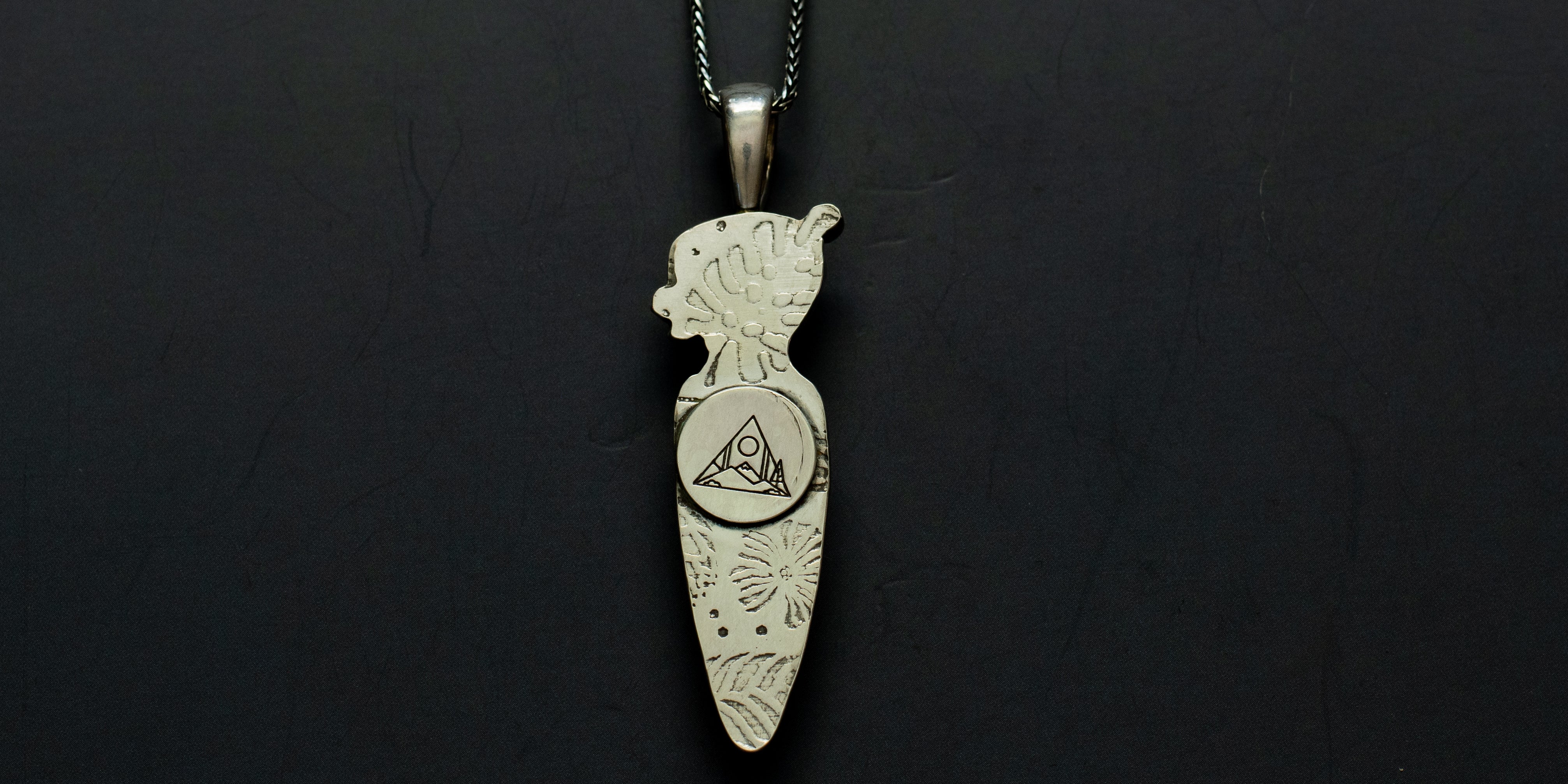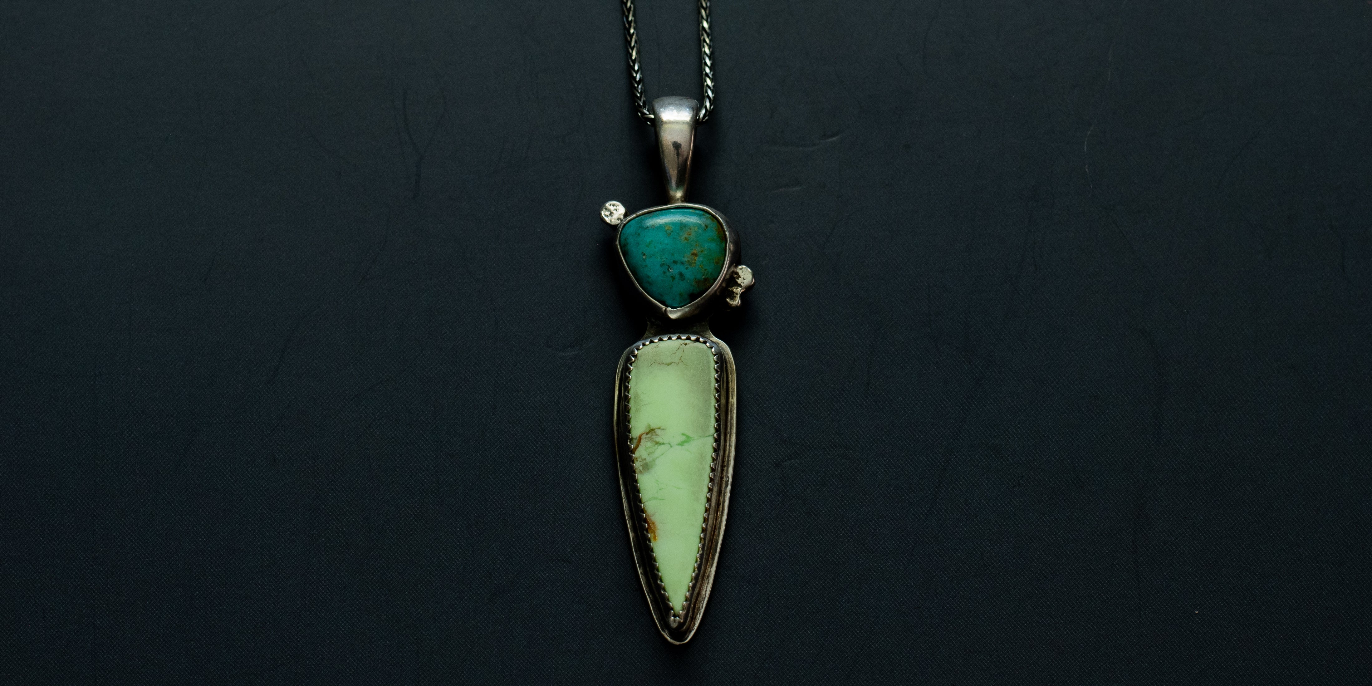 Glowing lemon chrysoprase and a sweet cut of campitos turquoise, set in .925 sterling silver. The back of this pendant has a plant/tropical design imprinted on it using a rolling mill and it's hanging on a sturdy, 18", sterling silver, wheat chain.