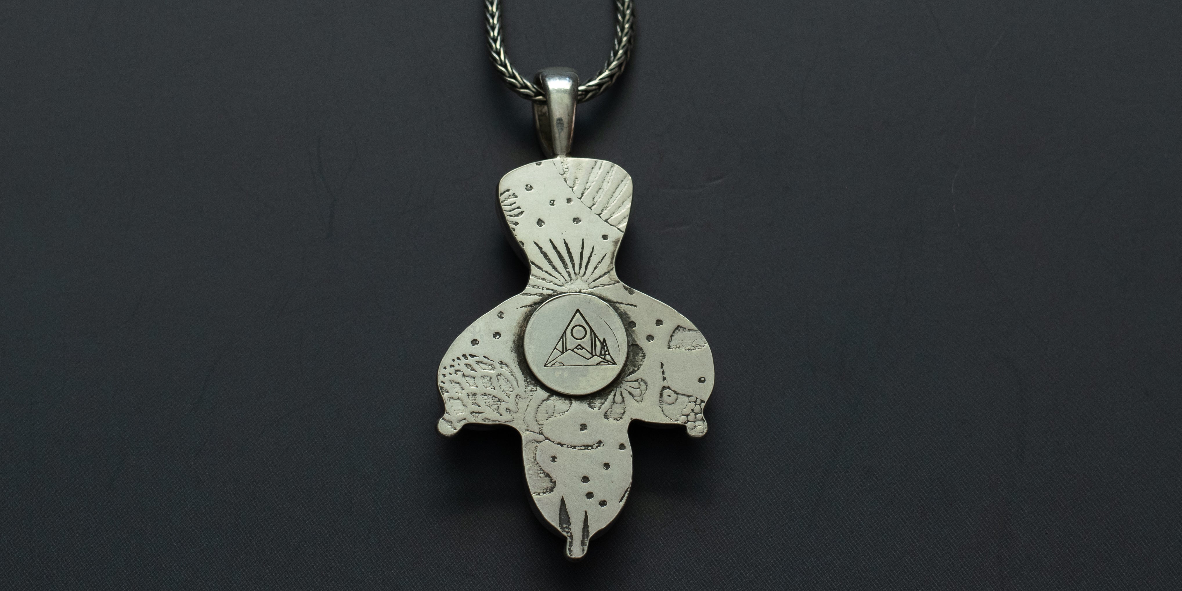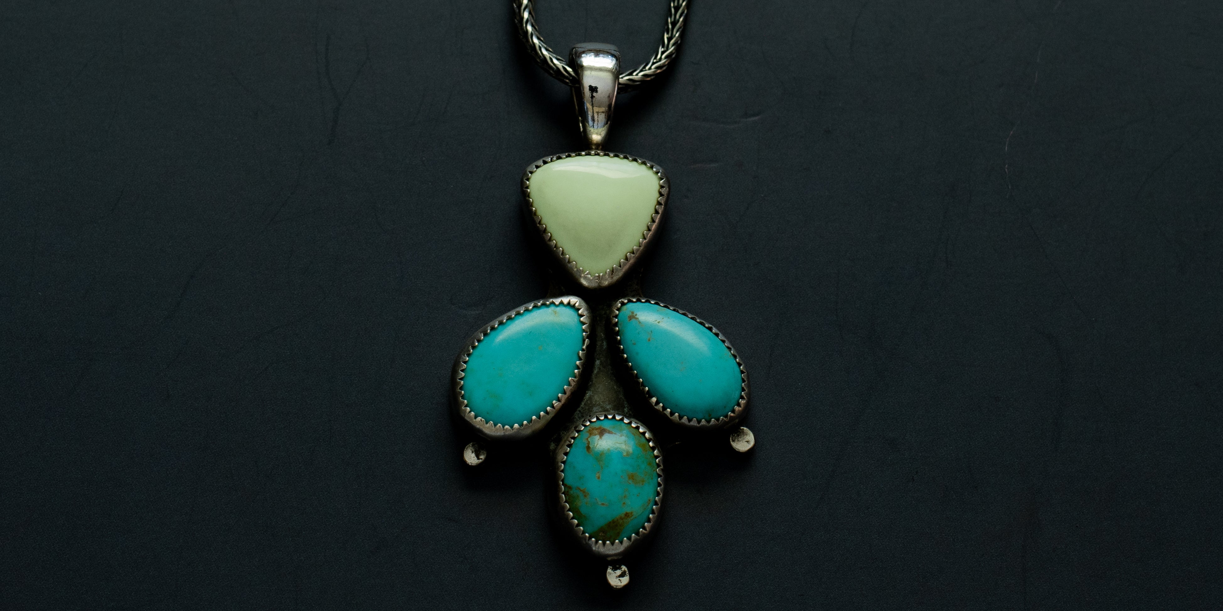 Glowing lemon chrysoprase, two Kingman turquoise teardrops and a campitos turquoise stone, set in .925 sterling silver. Made to look like a cute cactus. The back of this pendant has a plant/tropical design imprinted on it using a rolling mill and it's hanging on a sturdy, 18", sterling silver, oxidized, foxtail chain.