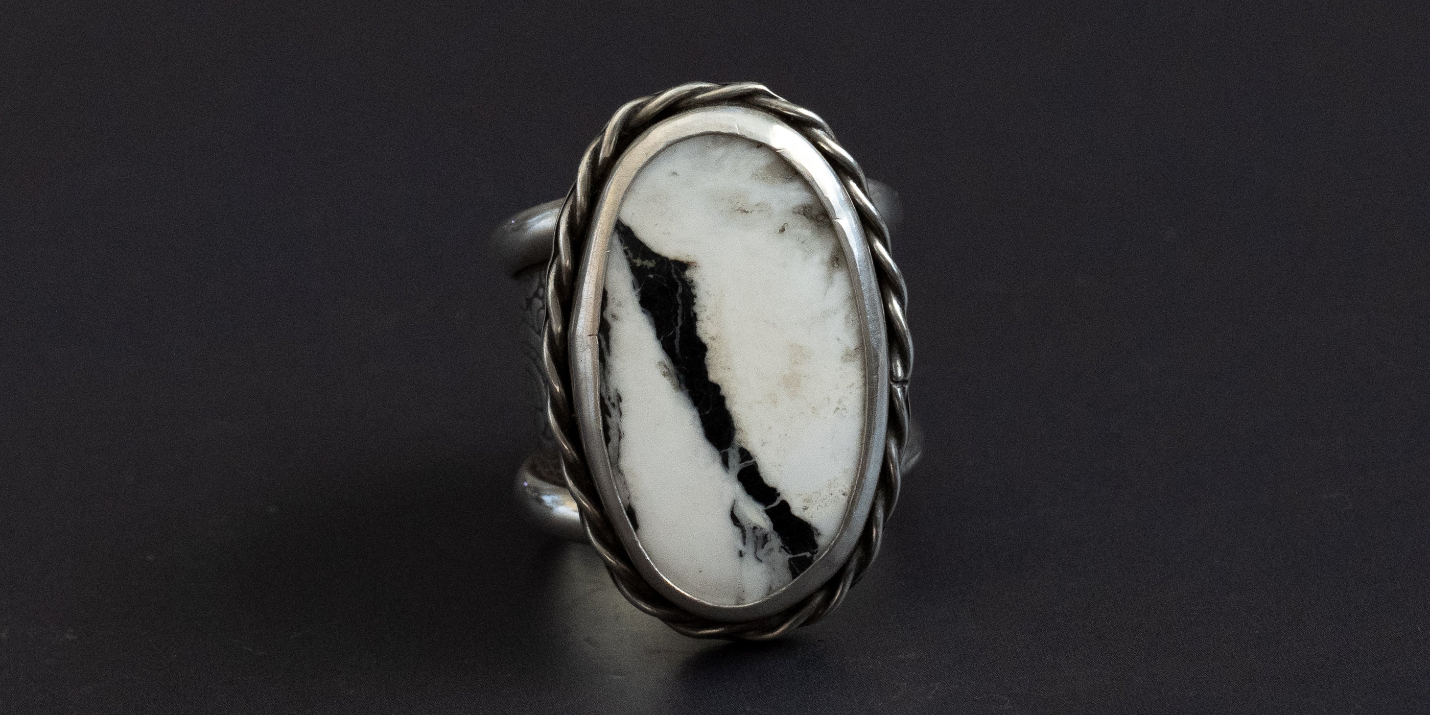 This White Buffalo ring has a truly captivating and one-of-a-kind presence. It's handcrafted with intention in my Joshua Tree studio using recycled .925 sterling silver, making it a thoughtful, sustainable choice. The focal point is a beautiful, American-mined White Buffalo stone, celebrated for its striking black and white patterns that make each piece unique. This ring feels both bold and elegant on the hand, a statement piece that's comfortable enough for daily wear. It’s a little piece of wearable desert art, made with soul just for you.