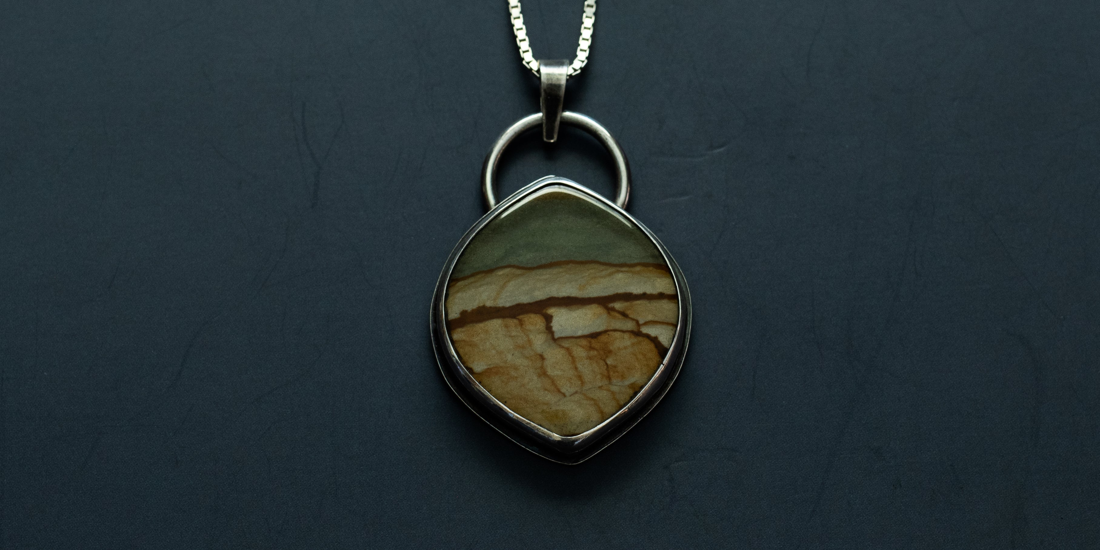 Cripple Creek Jasper set in .925 sterling silver and hanging on an 18" sterling silver box chain