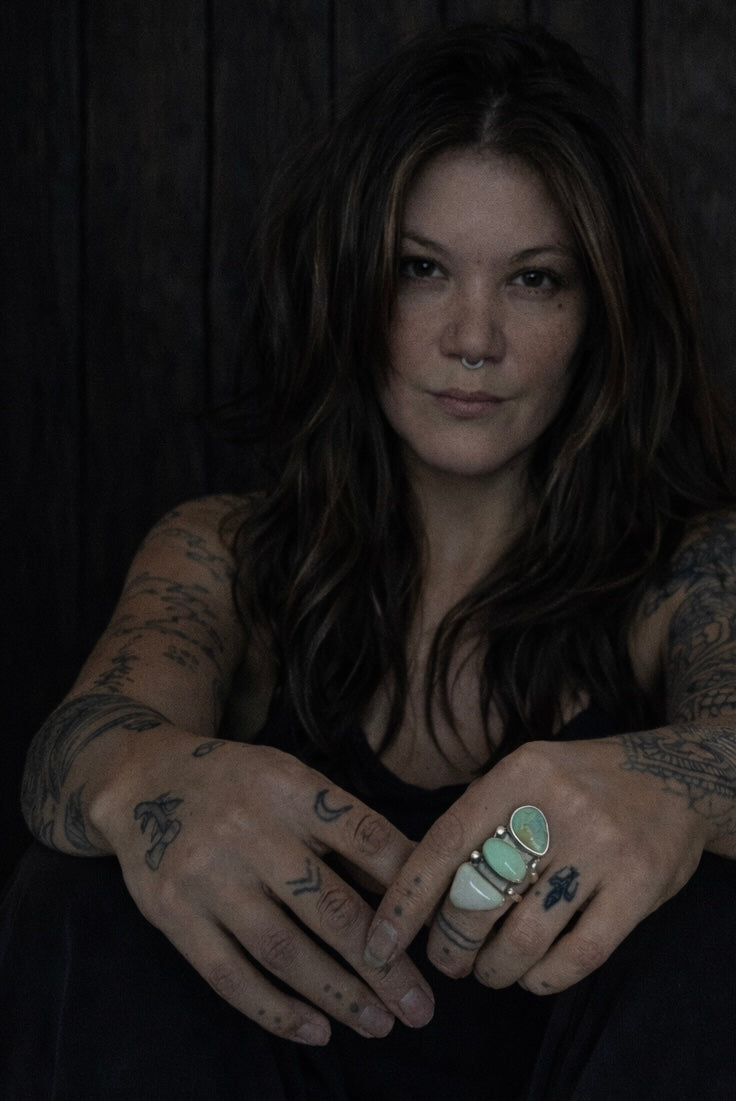 This stunning ring is a lovely rock stack for your finger, combining a vibrant mix of colors and textures. Handmade with intention in my Joshua Tree studio, it features a glowing chrysoprase stone perched atop a double stack of turquoise—a beautiful Royston in the middle and a classic Kingman at the base. The entire arrangement is set in sturdy sterling silver and features a comfortable double split shank. This is a bold and unique piece of wearable art that captures the spirit of the desert. It's a special treasure designed to make a statement and bring joy to your collection.