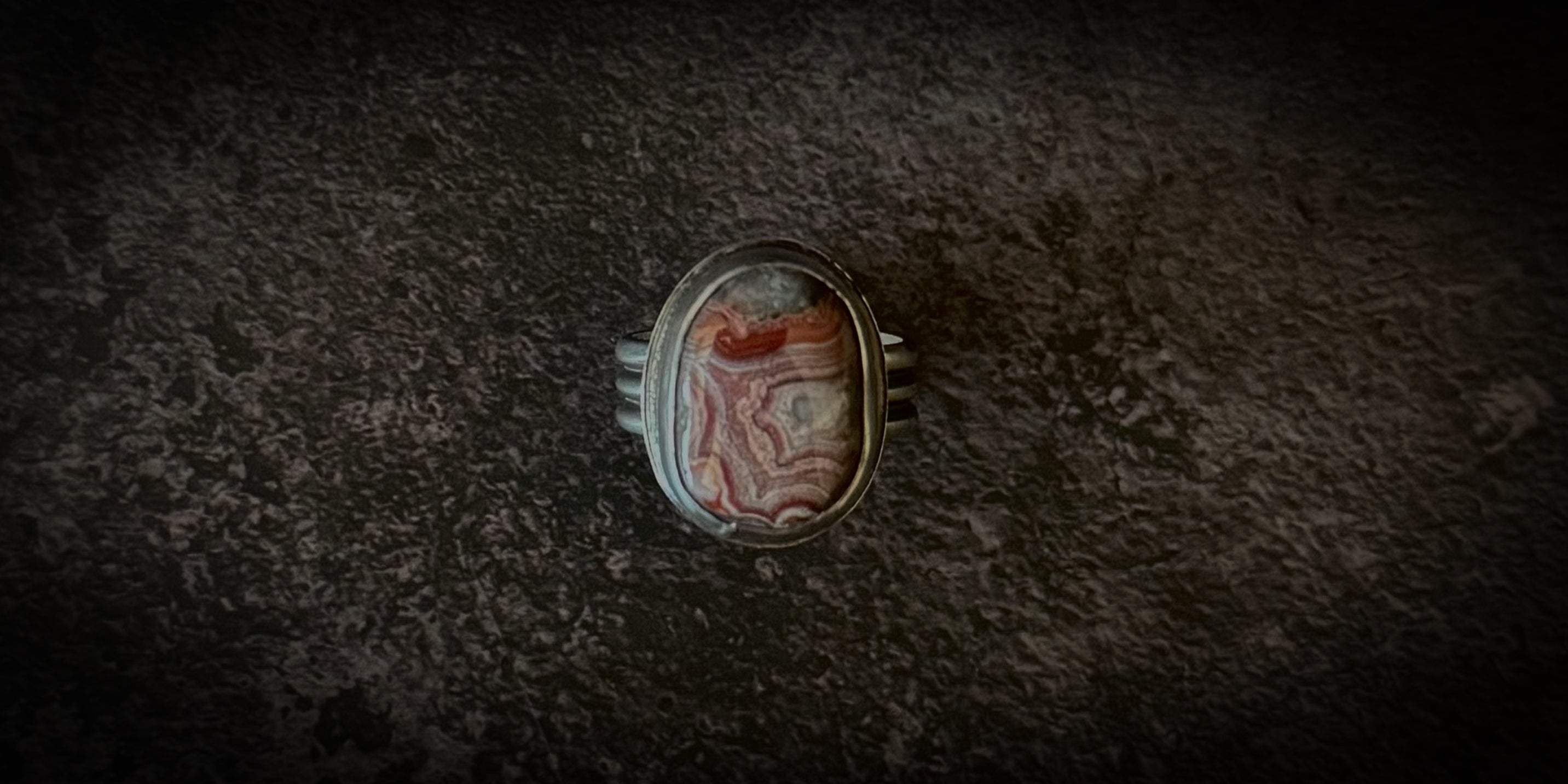 This Crazy Lace Agate ring is pure joy, like a party on your finger. Carefully handcrafted in my Joshua Tree studio, it features a stunning Crazy Lace Agate, known for its intricate, joyful patterns, set on a sturdy double stack of .925 sterling silver. This design gives the ring a substantial, high-quality feel that’s incredibly comfortable to wear. This piece is a celebration of natural artistry and unique style. It’s a one-of-a-kind treasure that’s sure to bring a smile to your face every time you look at it.