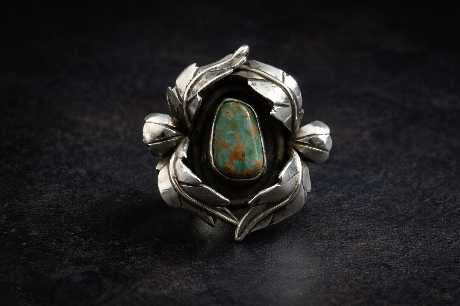 From the high desert of Joshua Tree, this ring emerges as a piece of wearable poetry. A captivating Fox Mine turquoise stone, with hues that echo desert skies, rests at its heart. Crafted from .925 sterling silver, the setting is adorned with hand-fabricated sterling silver leaves and delicate wire details that seem to grow organically around the stone. This intricate metalwork, born from patient hands, transforms the ring into a small sculpture for your finger.