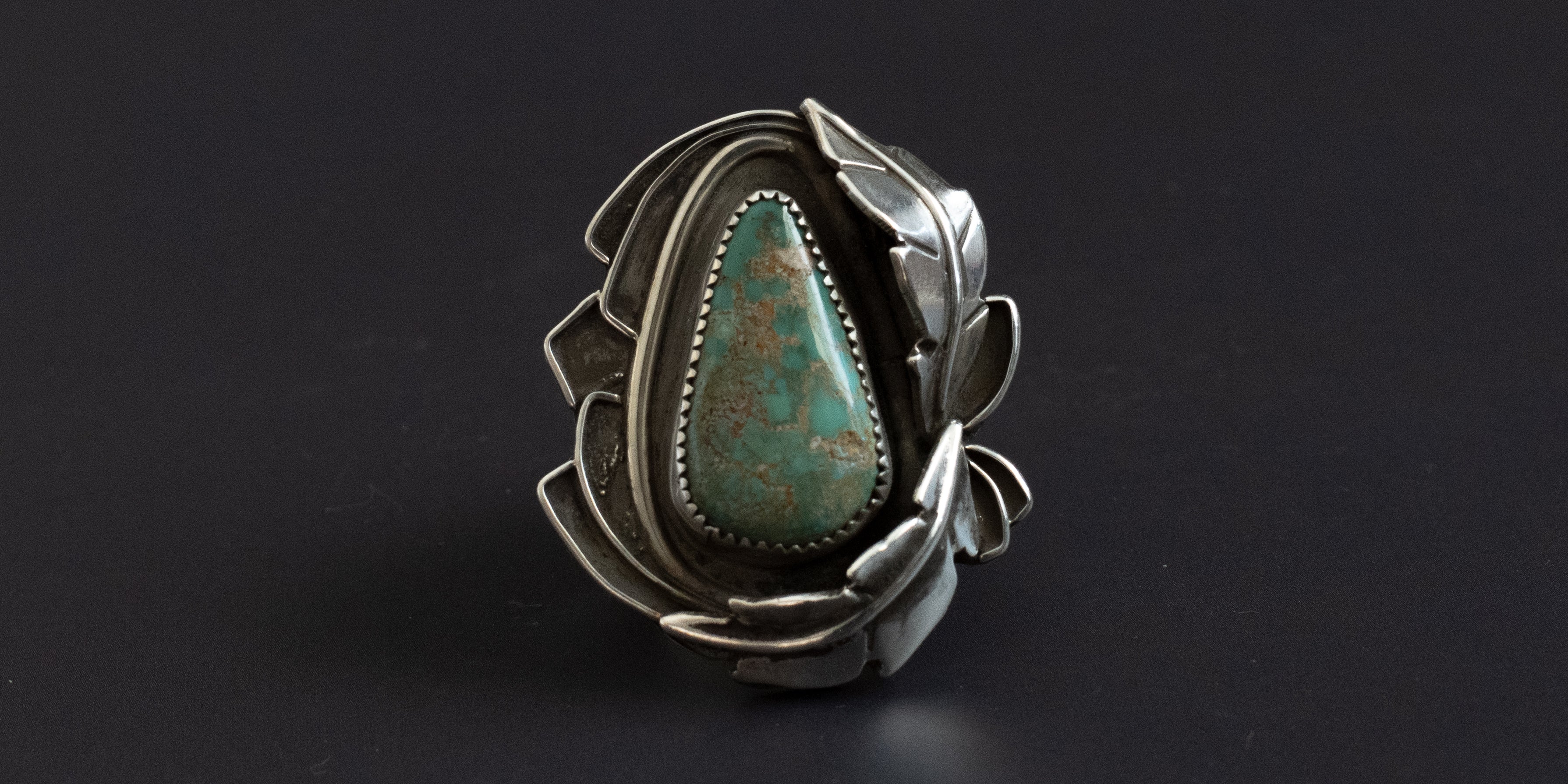 Made with reclaimed sterling silver, this piece showcases a hand-selected Fox Mine turquoise stone. Every ring is shaped and finished by hand, emphasizing sustainable processes and traditional jewelry making. The natural leaf motif highlights the unique qualities of each stone.