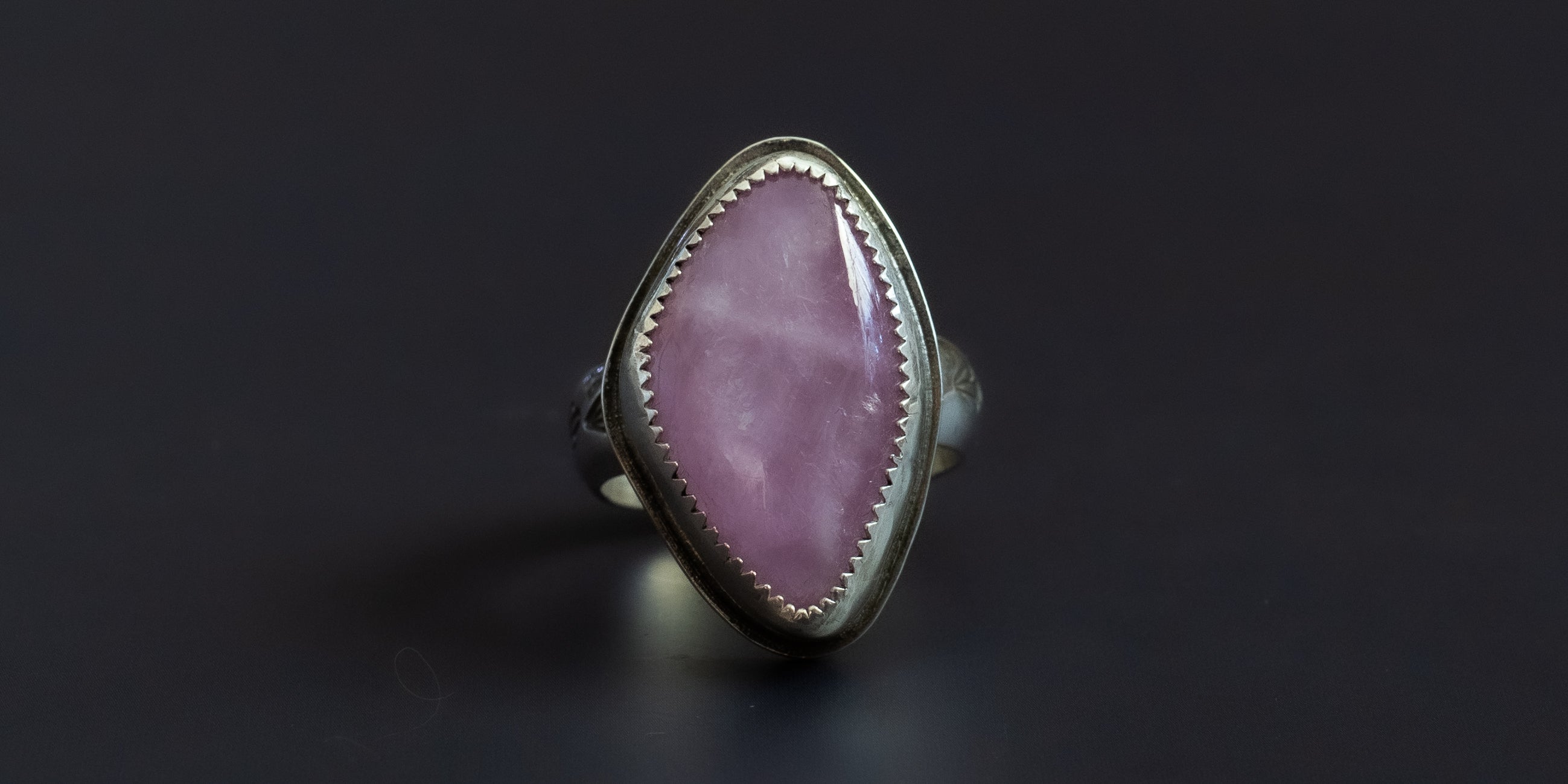 This handmade Kunzite ring features an ethically sourced pink-lilac gemstone and a 925 sterling silver setting. Each stone has its own character, with natural inclusions making every ring a little different. The band has been hand-stamped for little extra pizzazz. Comfortable for everyday wear or special moments.
