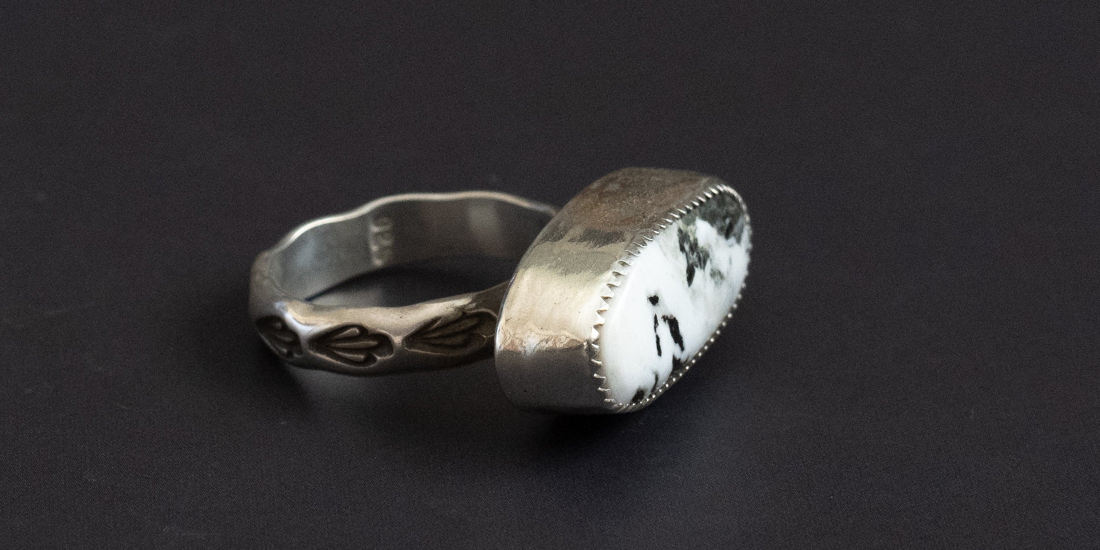 This White Buffalo ring is a truly stunning piece, featuring a captivating one-of-a-kind presence. It's thoughtfully handcrafted in my Joshua Tree studio from recycled .925 sterling silver, making it a sustainable and meaningful choice. The centerpiece is a beautiful, American-mined White Buffalo stone, celebrated for its unique black and white patterns that ensure no two rings are ever alike. It’s a little piece of wearable desert art, made with soul just for you.