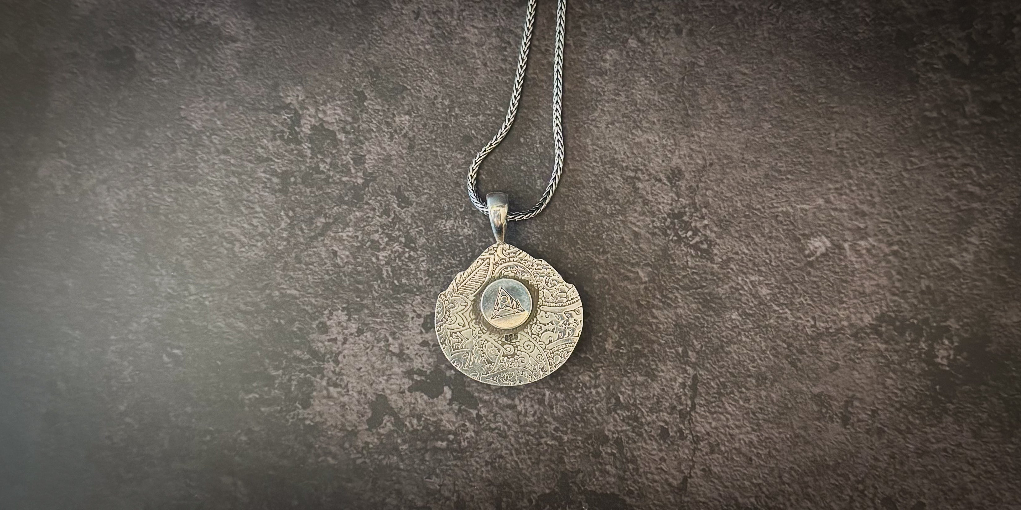 A teardrop Starfox variscite stone is set in .925 sterling silver, accented by wire detailing and a paisley design stamped on the back. The pendant hangs from an 18-inch oxidized sterling silver foxtail chain. Each necklace is handcrafted in my studio in Joshua Tree, CA. This unique piece highlights natural materials and distinctive design.