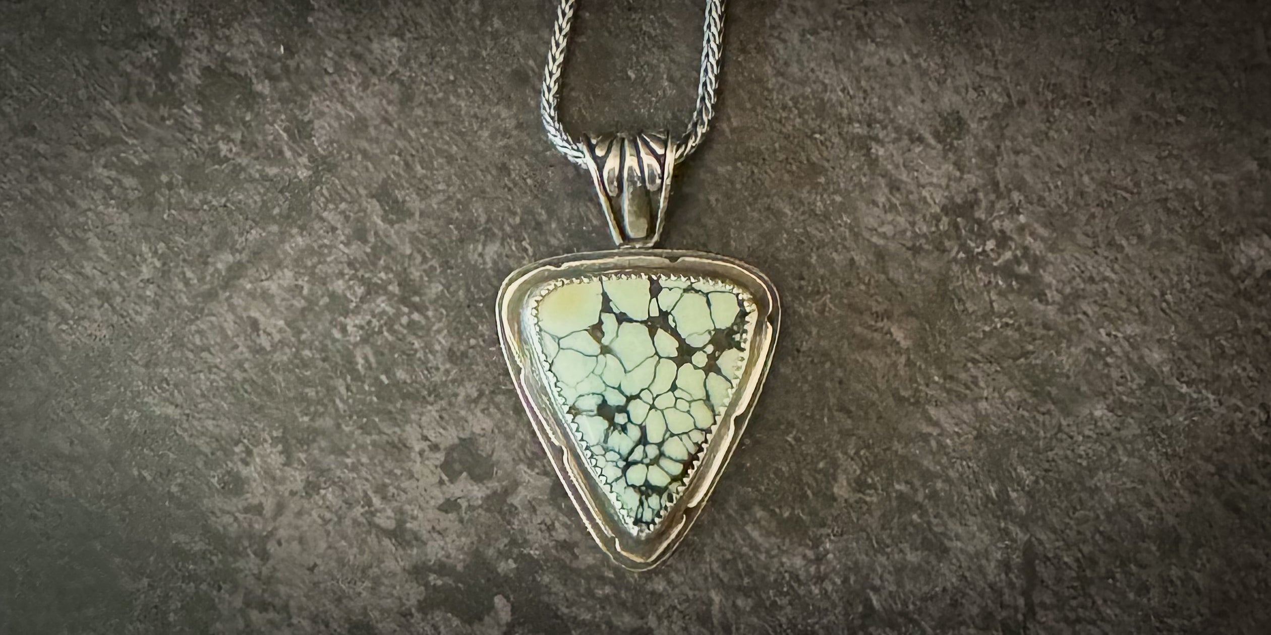 A genuine Starfox variscite stone set in a double stack of .925 sterling silver, hanging from an 18-inch oxidized foxtail chain. Each necklace is handcrafted in my Joshua Tree studio. The sterling silver is cut, shaped, and finished by hand for a unique, durable piece.