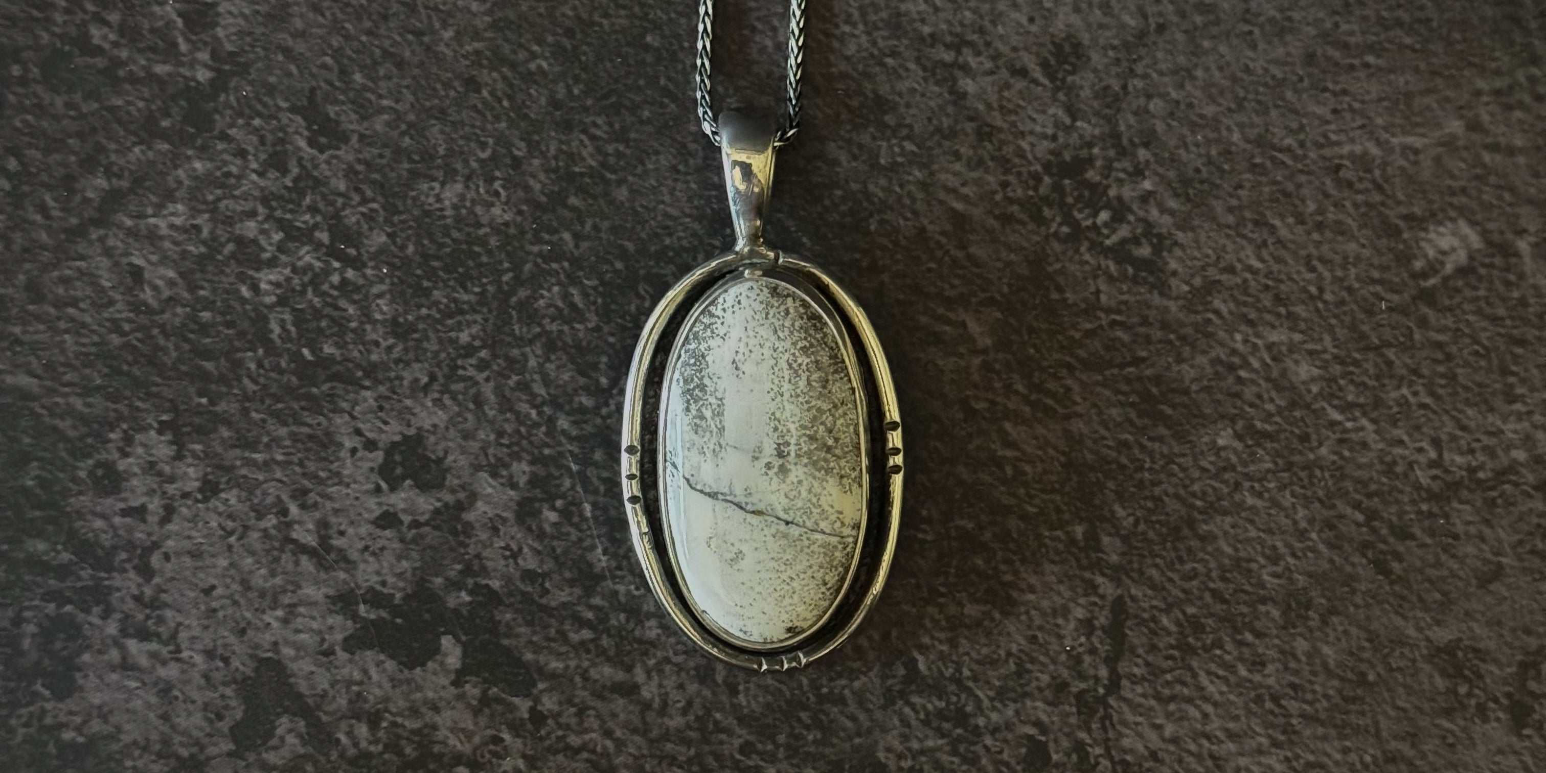 A White Buffalo stone is set in .925 sterling silver with clean, minimal detailing. The pendant hangs from an 18-inch sterling silver wheat chain. Each necklace is handcrafted in my studio in Joshua Tree, CA. This piece showcases quality materials and skilled artisan work.