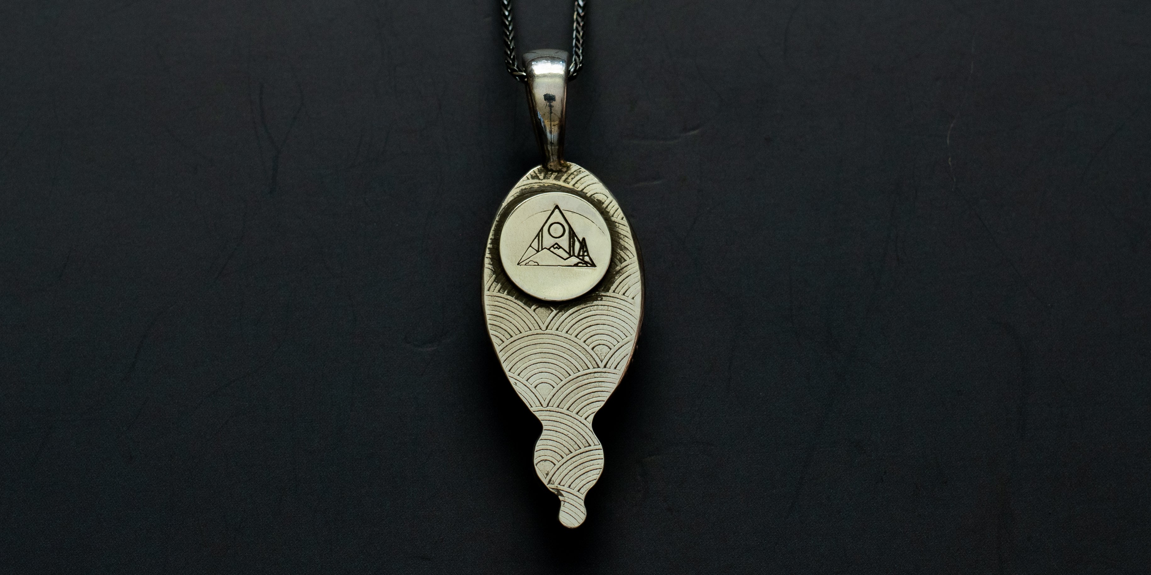 Glowing lemon chrysoprase with a tiny Kingman turquoise stone, set in .925 sterling silver. The back of this pendant has a rainbow design imprinted on it using a rolling mill and it's hanging on a sturdy, 18", sterling silver, wheat chain.