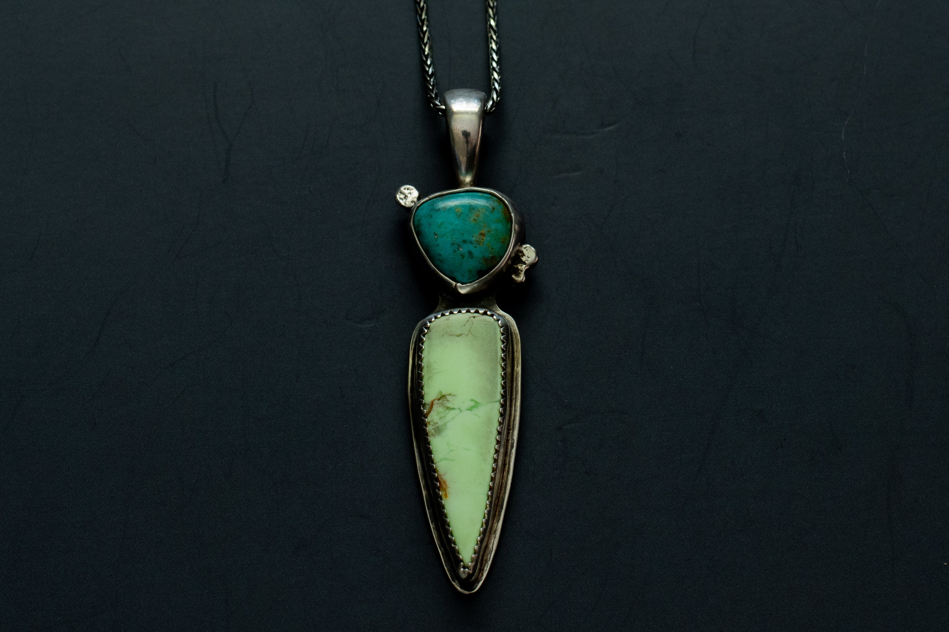 Glowing lemon chrysoprase and a sweet cut of campitos turquoise, set in .925 sterling silver. The back of this pendant has a plant/tropical design imprinted on it using a rolling mill and it's hanging on a sturdy, 18", sterling silver, wheat chain.