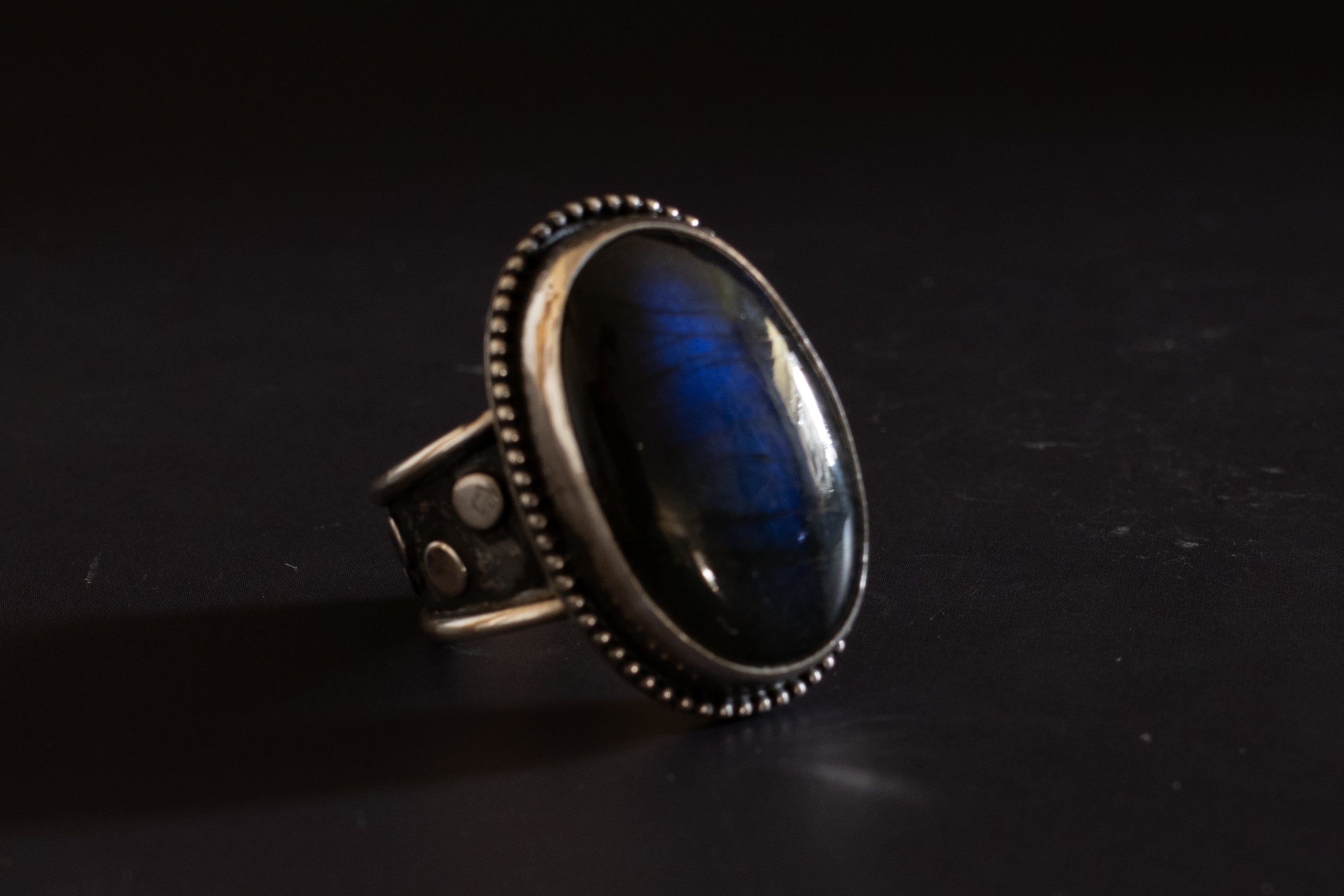 Dark, moody, and impossible to ignore — this handcrafted labradorite ring captures the quiet magic of the desert at dusk.