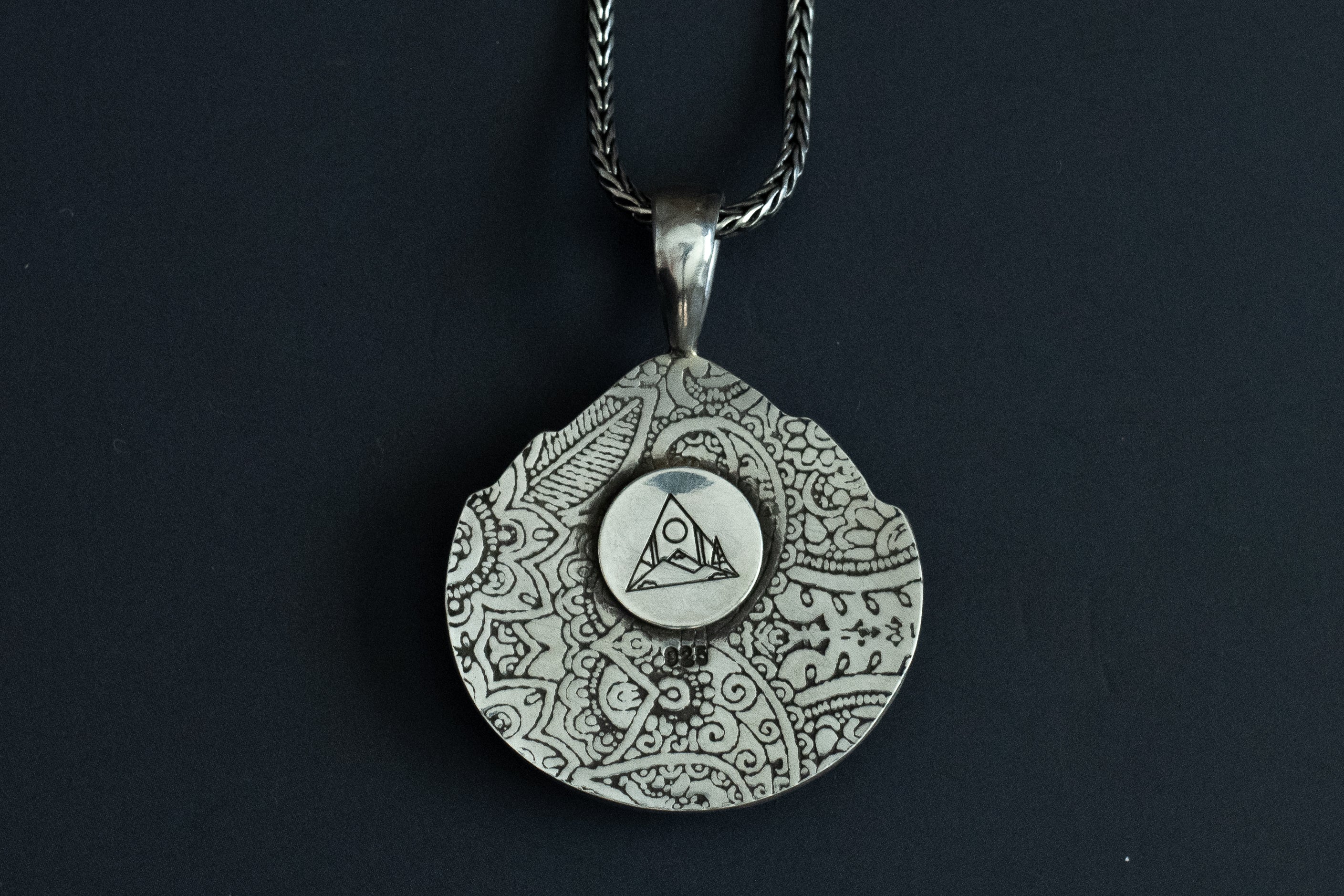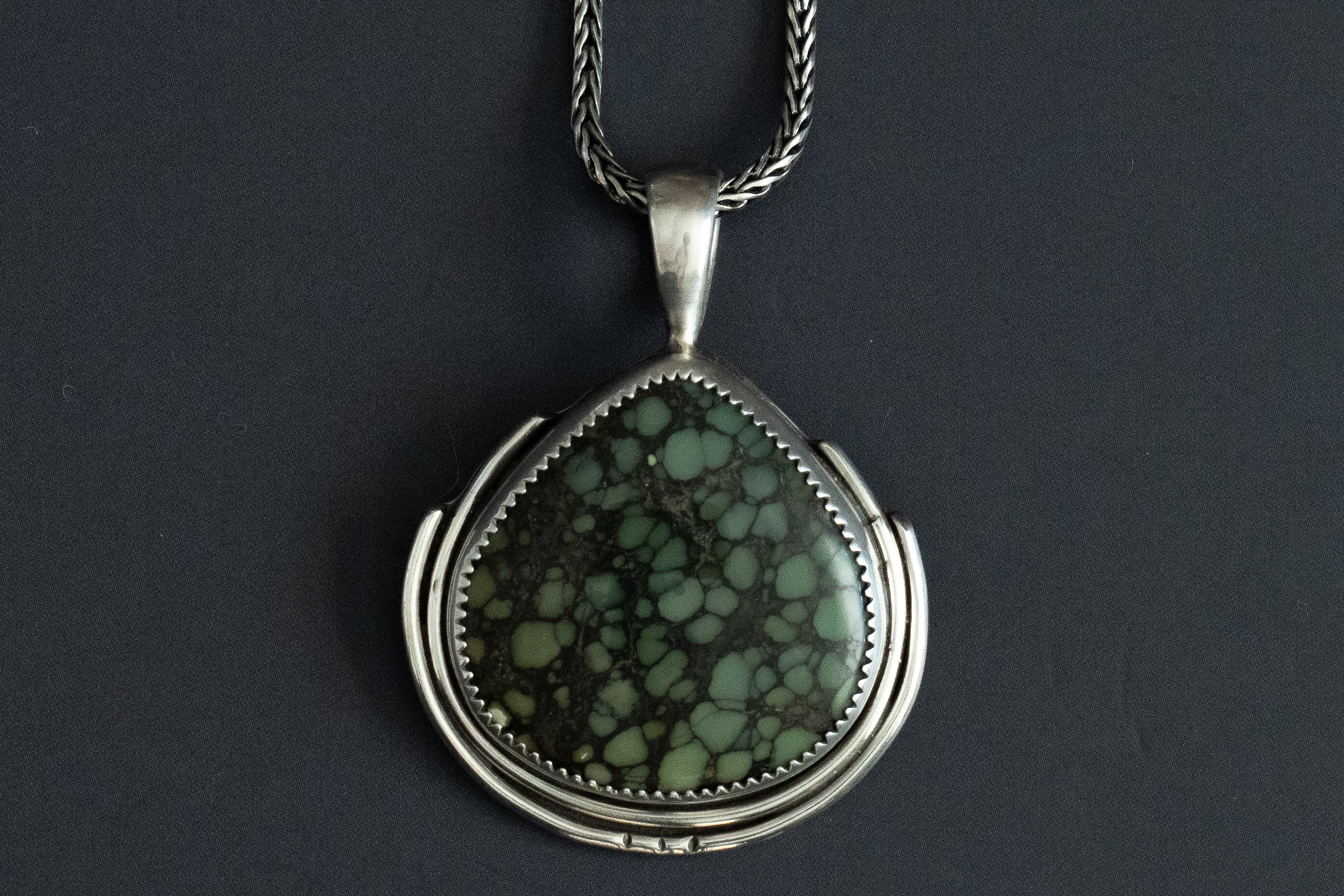 This handcrafted necklace features a striking teardrop of Starfox variscite stone nestled in .925 sterling silver, adorned with delicate wire work and an intricate paisley pattern on the reverse. The pendant suspends gracefully from an 18-inch oxidized sterling silver foxtail chain, creating an elegant layering piece or standalone statement. Meticulously crafted in Joshua Tree, CA, this one-of-a-kind design celebrates the natural beauty of variscite while showcasing artisanal metalwork. The pendant measures 1 3/4" from bail to point and 1 1/4" at its widest, making it a perfectly proportioned accent for any collection.