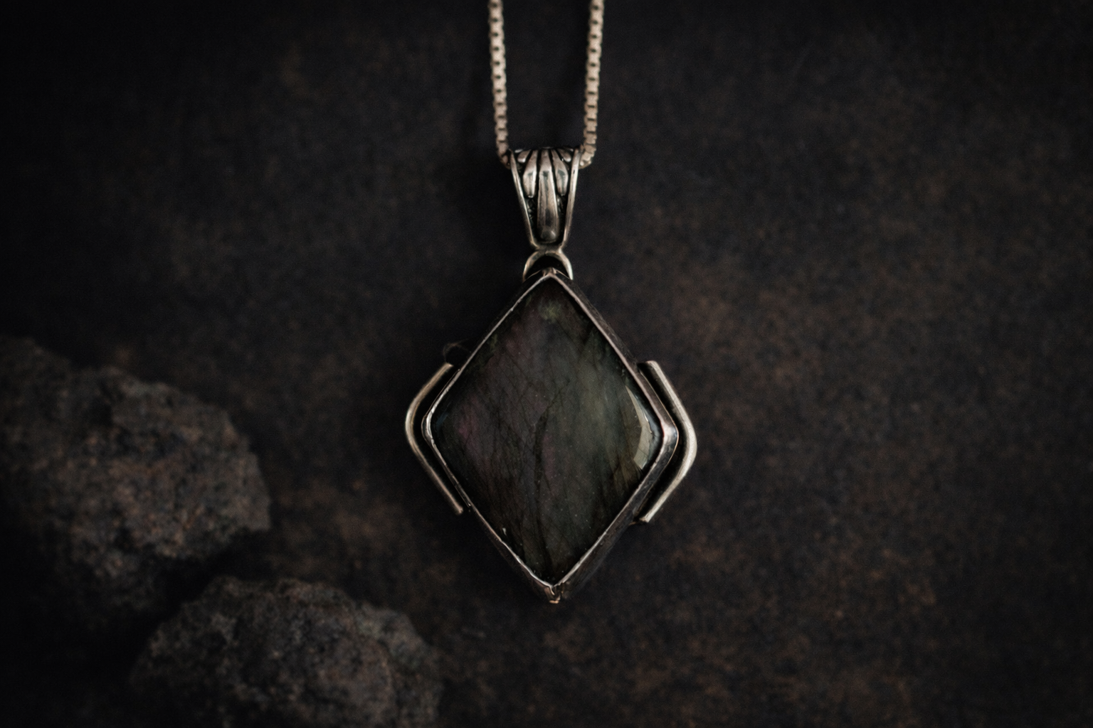Labradorite stone with a lovely pink/purple flash set in .925 sterling silver. Hanging on an 18" sterling silver box chain